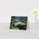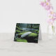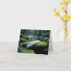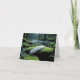 A serene forest scene features a white feather resting on a moss-covered rock beside a tranquil stream for blank note card
