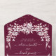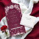White floral cascading garland burgundy wedding All in One Invitation. A beautiful white cascading garland adorns this all in one wedding invitation with gold confetti and detachable RSVP. The names are in script typography.