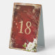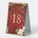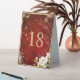 Gorgeous white botanical floral spray with sparse gold leaves over hanging this beautiful table marker. The scarlet red rustic background is such a rich classy look. This is a lovely marker for your reception tables.. Trimmed in faux gold glitter to set the tone for romantic and classic elegance. Gold splashes finish off this pretty marker. Beautiful for any season.