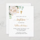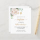 A white background decorated with eucalyptus greenery, a white peony, and golden leaves. Personalise and the childs name and ceremony details. Black and golden coloured letters.