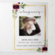 An elegant tri-fold program. A white background, a faux gold frame, burgundy florals and space for your photo. Personalise and add name, dates and your text.