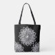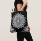 An Elegant Tote Bag with an intricate Abstract Mandala Design of a White Flower, representing the blossoming of Purity within our Soul. Originally hand painted with Fluorescent Acrylics by SunFreeStar.