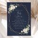 Invite friends and family in style and set the tone for your special day with this charming baby shower invitation. Design features white watercolor flowers, greenery and gold frame on navy blue background.