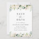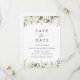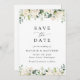 Invite friends and family in style and set the tone for your special day with this charming save the date card. Design features white watercolor flowers and greenery on white background.