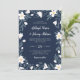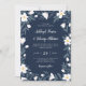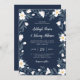 Beautiful floral wedding invitation with white flowers on navy blue. White and navy blue floral wedding invitation with traditional wording in white. Traditional floral wedding invitation with whimsical flowers in white and slate blue.