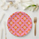 White Flowers on Mid Century Pink Circles Pattern Paper Plate