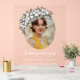 Acrylic transparent in loving memory sign with your loved one's photo inside an oval with pretty white flowers and their name in a modern font. Beautiful transparent acrylic floral funeral sign honouring your loved one and personalised with their name and photo inside an oval shape and adorned with printed white flowers. In loving memory acrylic sign personalised with photo with a white and green floral design for a funeral or memorial service for your daughter, sister, wife, mother, or grandmother.