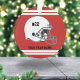 White football helmet, black number, and grey face guard. Customisable areas include: jersey number, team name or personalised with a name. Red background with white jersey stripes.