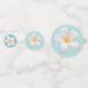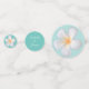 Wedding White Frangipani Plumeria Flowers on teal and light blue Table Confetti. Text can be personalised for wedding, anniversary,and Birthdays. Frangipani flowers stand for beauty and perfect love.