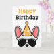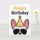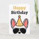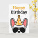 White coloured french bulldog wearing a yellow party hat and black aviator sunglasses.