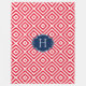 Elegant modern white geometric seamless pattern over custom coral-red background. Navy blue accents and custom monogram
