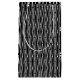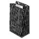This gift bag has a geometric design of sort of flat-ended ovals repeating across the design in white on a field of black.