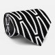 This necktie has a geometric design of sort of flat-ended ovals repeating across the design in white on a field of black.
