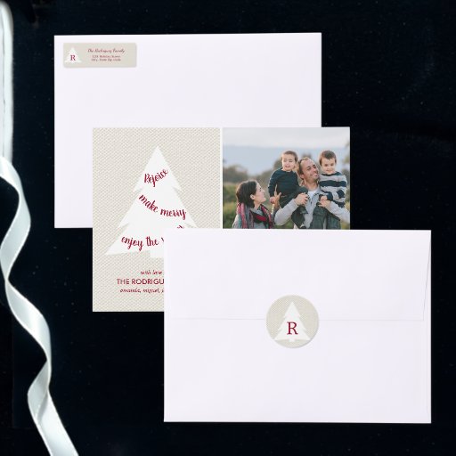 Add elegance to your mail or gifts with stickers featuring a modern white geometric tree on a beige faux textured background and a burgundy monogram within the tree. Click to personalise or delete the initial. Perfect for the holidays.