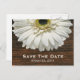 A wedding save the date featuring an image of a white gerbera peeking from top of front over a background of barnwood. Personalise the text on front and back.
