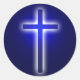 Unique christian sticker with white glowing religious cross on navy blue background.