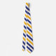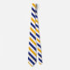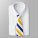 This white, gold, and blue diagonally-striped tie has both an old-school and a modern feel.