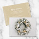 Flat holiday greeting cards feature a beautiful snow flocked pine wreath decorated with white and gold Christmas tree ornaments and flowers on the front. Your personalised greeting and names are printed on a gold background on the back. Be sure to double-check your order before adding it to your cart as what you see on the screen is what will be printed. The Live Design Service can help you with your design layout if needed.