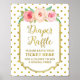 Diaper raffle sign poster for baby shower in white and gold dots pattern with gold border, rustic pink and peach watercolor flowers and handwritten style lettering.