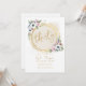 A white and gold, glam, modern, elegant and chic 30th birthday party invitation template featuring gold, interlaced hexagons (the gold is a digital effect, not real foil), a watercolor stain in a hue of gold, delicate floral bouquets of anemones, eucalyptus and foliage and pink roses and the word "thirty" in modern calligraphy script. The typography in a gold hue rounds up this white and gold floral thirtieth birthday party invitation template for a woman celebrating her thirtieth birthday.