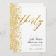A white and gold, glam, modern, elegant and chic 30th birthday party invitation template featuring the word "thirty" covered in gold foil (this is a digital effect), modern calligraphy script and typography in a gold hue, as well as a geometric motif inspired by glitter: gold and pink dots. A chic, timeless design for a woman on her thirtieth birthday.