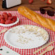 White birthday party paper plates with gold glitter and string lights customised with the name and age of the guest of honour.