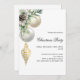 For a Christmas party with family and friends. An elegant, modern white background. Decorated with gold and white baubles and some greenery and a pine cone. Personalise and add the details.