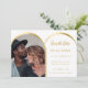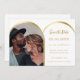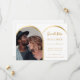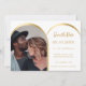 On front: Add your own vertical size photo. Faux gold photo arch frame. A white background, golden text. Personalise and add your names and the date.