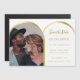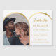 Add your own vertical size photo. Faux gold photo arch frame. A white background, golden text. Personalise and add your names and the date.