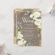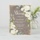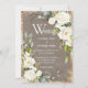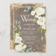 Gorgeous white botanical floral spray of hydrangeas and roses with greenery, eucalyptus and vintage gold accents. Beautiful rustic brown background. This is such a beautiful invitation. Beautiful and perfect for any season and your special event.