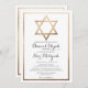 This modern and elegant bar mitzvah invitation with the Hebrew name is perfect for your child's special day. It features a faux printed gold foil Star of David and border on top of a simple white background with ornate cursive typography. It's chic, minimalist, and regal.