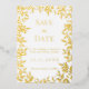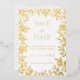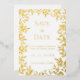 A classic white background. Decorated with gold foil botanical foliage. Personalize and add the Save the Date details. Real gold foil text on the front.
