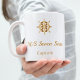 A white background. Decorted with a faux gold steering wheel. Personalise and add the boat name, title/text.