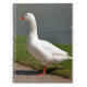 White domestic goose (Anser anser domesticus) near of pond with swimming swan