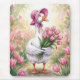 A white goose holds a vibrant bouquet of pink tulips amidst a picturesque spring garden, brought to life through a stunning watercolor effect
