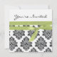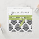 design has an elegant black damask Pattern against a white background with a faux green ribbon. The reverse of the card has a cute little rhyme. All text is fully customisable. you can also alter the background colour of the card by clicking on 'customise' and then 'colour'. invitation is shown here in a linen finish. other finishes are available!
