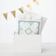 This favour bag features a pattern of four white hearts surrounding a central diamond outlined in grey on a light blue background - great for a bridal shower, christening, or wedding.