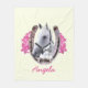 Painted white horse on a cream background framed by a horseshoe and pink rhododendrons. Your name in pink right below the horse portrait. There is a scattering of sparkles across the bottom of the horseshoe too.