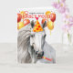 Lovely white horse with red and yellow balloons on a birthday card fit for a major horse lover, cowboy or cowgirl.
