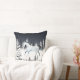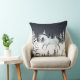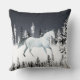 A black and white throw pillow featuring an Eastern pine tree forest rendered in charcoal with a wild white horse trotting through the snowy night sky landscape. A stunning modern pillow with quality graphics and composition.