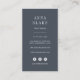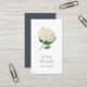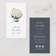 Elegant vertical business cards for florists, floral designers, wedding planners or other wedding professionals feature a watercolor hydrangea blossom illustration in green and white, with your name or business name beneath. Add your full contact details to the reverse side in white on a contrasting smoky blue background. Includes three social media icons and a template field for your social media handle.