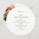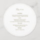 Stylish and chic. This round wedding card includes table number and wedding menu on either side. The design includes a contemporary set of fonts in olive green against white and ivory backgrounds. The template includes 4 meal and drink sections.