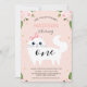 Sweet kitten themed first birthday invitation featuring a gorgeous cat, some pink roses floral arrangements and some faux gold foil dots on a pink background. This pretty birthday invitation design is ideal for cat lovers and a cute way to invite guests to your little girls very first birthday party.