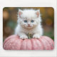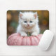 A fluffy white kitten with striking blue eyes sits adorably on top of a pink pumpkin