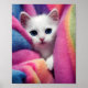 A loveable white kitten snuggled up in rainbow blankets. Pretty self-explanatory. What's not to love about this adorable house critter?