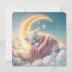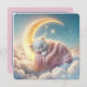 A fluffy white kitten is peacefully sleeping on a crescent moon and a bed of clouds, wrapped in a soft pink blanket.