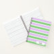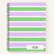 A notebook designed with a white, lilac and green striped pattern. Customise the notebook with your special name or text among other options.