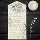 Your wedding day is a celebration of purity, grace, and the beauty of eternal love. This All-in-One wedding invitation embraces the elegance of white lilies and lily of the valley, set against a gentle pale yellow background, to create an invitation that exudes sophistication and charm. The All-in-One wedding invitations are both beautiful and practical by combining the wedding invitation with an easy to remove perforated RSVP postcard. They are also quick and easy to prepare for mailing. Simply address the invitation, fold the back flap and seal with the included clear stickers. Once your guests receive the pre-addressed invitation they simply tear off the perforated RSVP card and drop it in the mail.