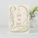 A wedding announcement card with an art nouveau inspired design, featuring white lilies with green leaves, forming an organic flowing frame on a beige background. Both sides can be customised.