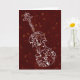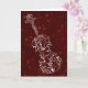 A white line drawing of a violin, comprised entirely of calligraphic scrolls and flourishes, is displayed at a diagonal angle upon a background of deep red with large golden speckles. Highly decorative in any case, this image would be most evocative for anyone who plays the violin and/or loves violin music. It is suitable for any number of occasions, from writing thanks to announcing a concert to extending a romantic invitation. Matching postage is available from MissPrinteditions' store.